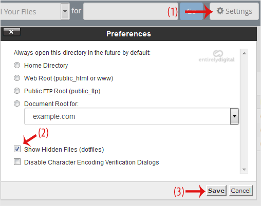 4. If the .htaccess file is not visible, click Settings in the top right corner of the File Manager. In the settings window, check the box next to Show Hidden Files (Dotfiles) and click Save. The .htaccess file should now be visible. If it is still not there, you can create a new one.