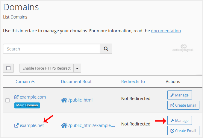 How to Update the DNS Nameservers at EntirelyDigital.com You can find our nameservers in your hosting welcome email. You need to update your domain... How to Redirect Your Website to Any Page or External Domain 1. Log in to your cPanel account. 2. In the Domains section, click on Redirects. 3. Under Add... How to Remove a Domain Redirect in cPanel 1. Log in to your cPanel account. 2. In the Domains section, click on Redirects. 3. Scroll down... How to Create an Alias or Park a Domain in cPanel An Alias domain, formerly known as a parked domain, lets you create a mirror of your primary... How to Remove Parked Domains/Aliases in cPanel 1. Log in to your cPanel account. 2. In the Domains section, click on Domains. 3. In the List...
