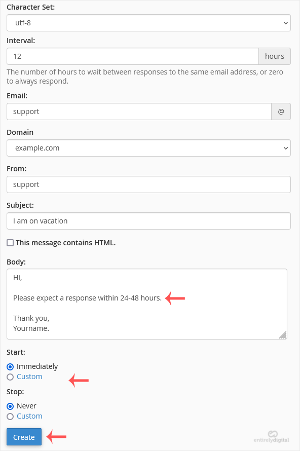 - Interval: Specify the number of hours you wish the autoresponder to wait between responses to the same email address.