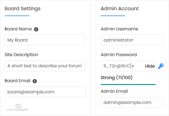 • Admin Username: Your new phpBB username (for security reasons, do not use the administrator or the admin username).