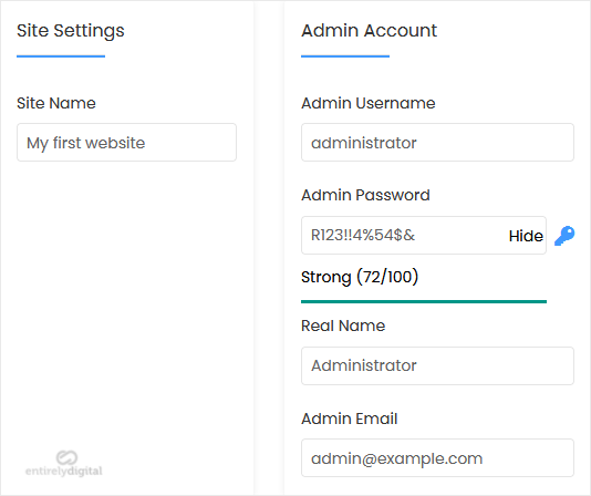 • Admin Username: Your new e107 username (for security reasons, do not use the administrator or the admin username).