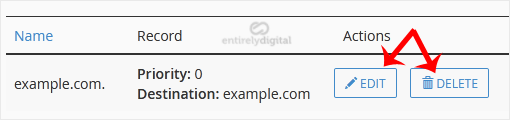 5. Locate the CNAME Record you want to edit or remove. Should you wish to edit a CNAME record, click on Edit. Modify the details, and click on Save Record. Removing a record can be done with Delete option.